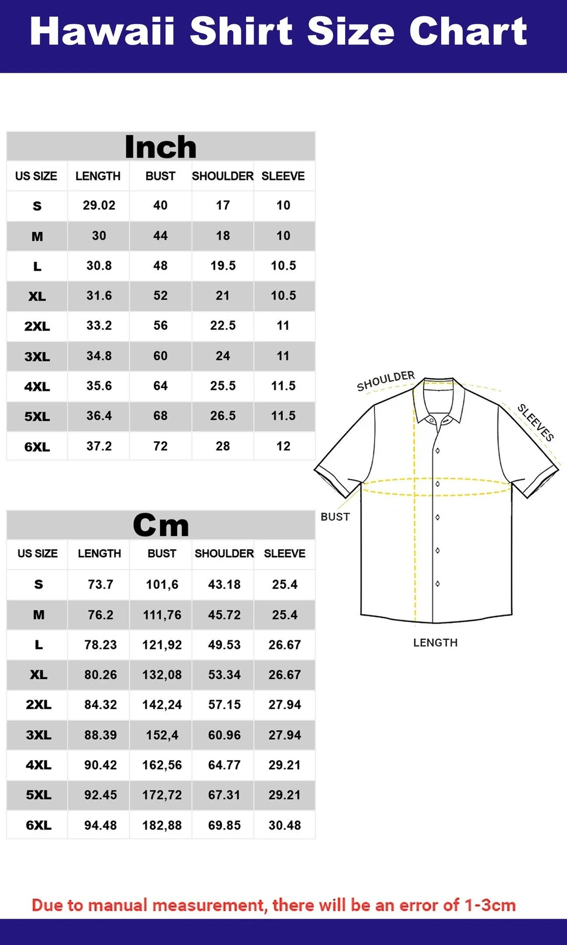 Size: Available in a full range from S to 5XL. For the best fit, refer to our size chart and guide in the provided picture – please note that our size chart is different from Amazon's. If you have any questions or concerns, feel free to contact us; we're here to help!